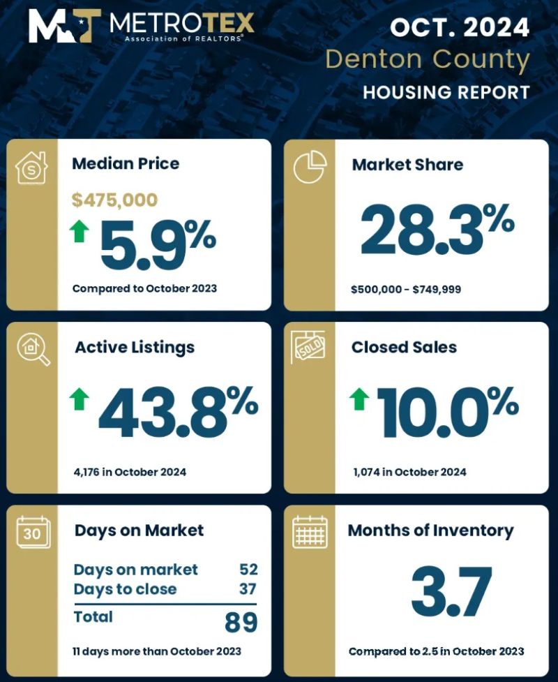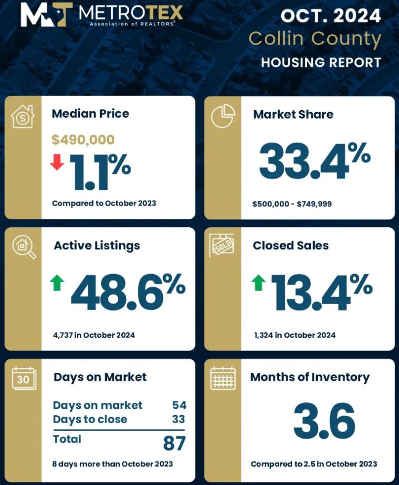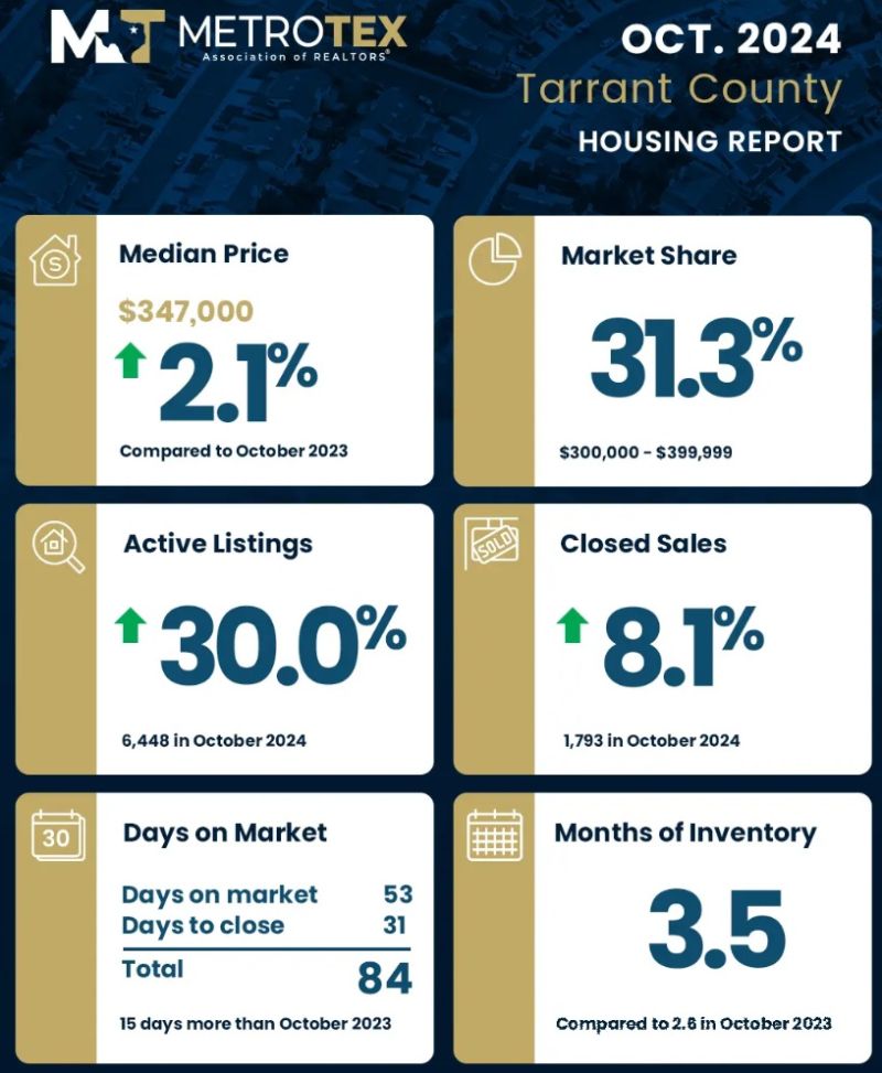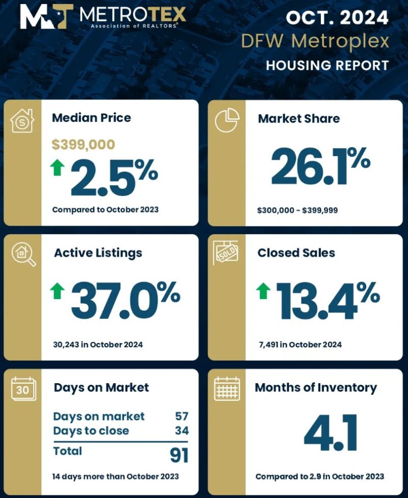 MetroTex(北德州地产经纪人协会)公布了达拉斯-沃思堡地区(Dallas-Fort Worth)2024年10月份房地产市场数据。10月份,DFW地区房屋价格中位数较去年同期(同比)上升2.5%,达到399,000美元;活跃房源增加37%,房屋库存量增长至4.1月(months of inventory),房屋销售上升13.4%。