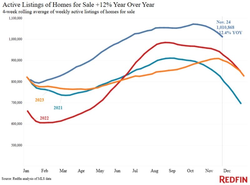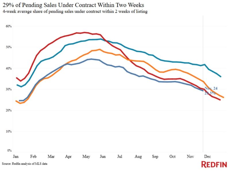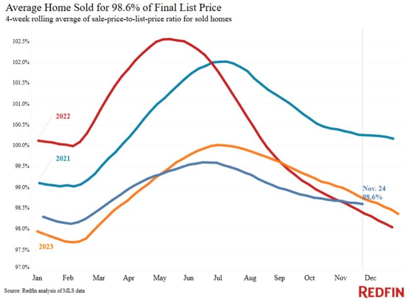 根据美国房地产网站 Redfin 针对全美400多个主要城市和都市圈的统计数据得出的市场报告,截至11月24号的四周时间内,全美平均房屋销售价格同比(去年同期)上涨7%,达到386,625美元,宾夕法尼亚州费城涨幅最大,达21.8%,降幅最大的城市是佛罗里达州的坦帕,也仅仅下降1%。挂牌在售的房屋数量同比增长12.4%,房屋库存增加至3.9个月,29%上市的房屋在两周内签约。25%的房屋以高于要价卖出。同时,房屋售价与要价之间的买卖价格比下降至98.6%。