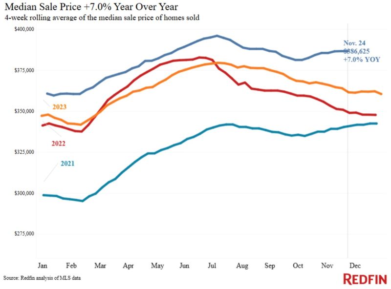房屋销售价格中位数较2023年同期上涨7%至386,625美元