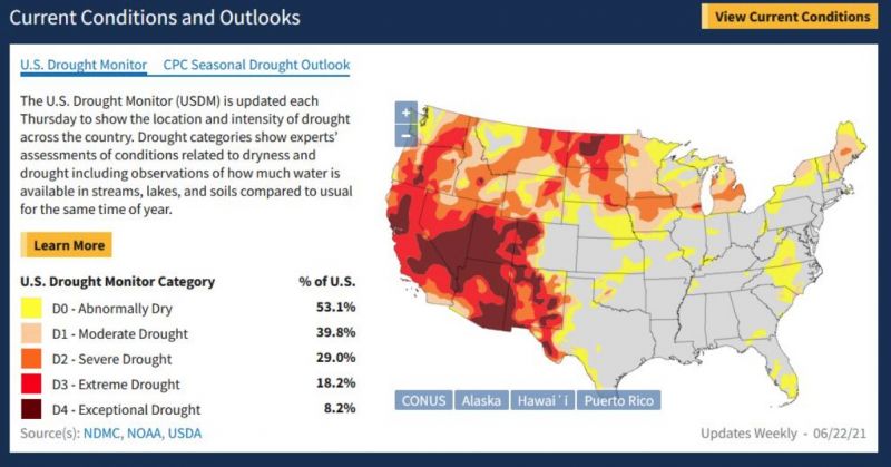 只要看一眼美国西部各州的干旱热力图,就足以将信息传递给人们。许多网站和组织一直关注着不断恶化的气象条件,包括国家综合干旱信息系统网站 drought.gov 的这个干旱监测。截至6月15日,美国西部超过26%的地区正在经历特殊干旱,这是美国国家干旱监测局认为最强烈的干旱程度,西部近98%的地区正在经历某种程度的干旱。在这轮始于11月的干旱之前,在过去20年中,西部地区在任何时候处理特殊干旱的最大比例仅为12%。
