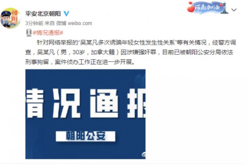 北京时间7月31日22点30分,北京市公安局朝阳分局官方微博“@平安北京朝阳”发布消息:针对网络举报的“吴某凡多次诱骗年轻女性发生性关系”等有关情况,经警方调查,吴某凡(男,30岁,加拿大籍)因涉嫌强奸罪,目前已被朝阳公安分局依法刑事拘留,案件侦办工作正在进一步开展。