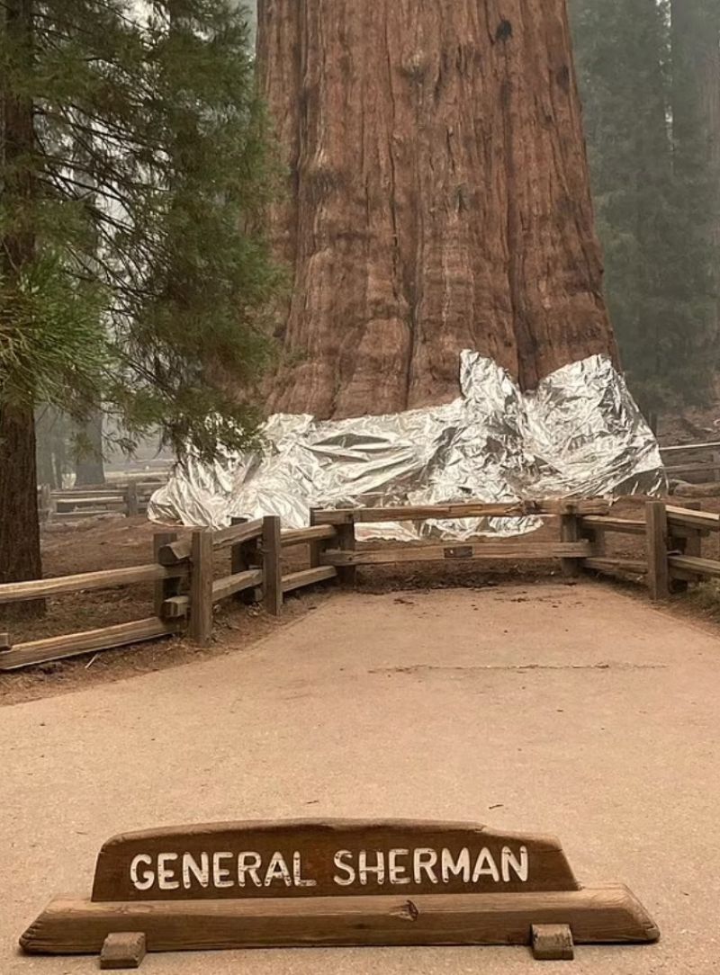 薛曼将军树是地球上最大、最古老的树木,高度近100米,树龄超过3000岁。公园为保护这群有千年以上寿命的世上最大型树木巨杉,消防人员今天赶紧用铝箔防火毯将它们包裹。消防员也在红杉国家公园内约2000棵古树当中清理灌木,并放置监测器。