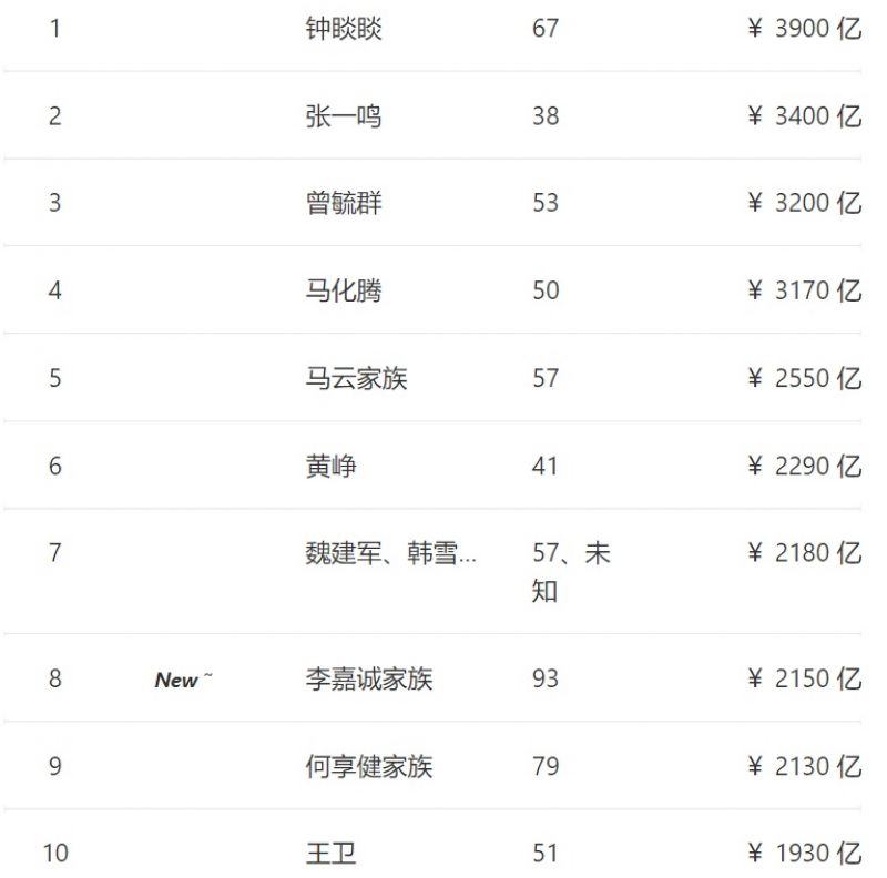农夫山泉67岁的钟睒睒财富比去年增长250亿,即7%,以3,900亿元首次成为中国首富。抖音创始人38岁的张一鸣财富增长至去年的3倍,增长了2,300亿,超过马化腾和马云,以3,400亿元跃居第二。