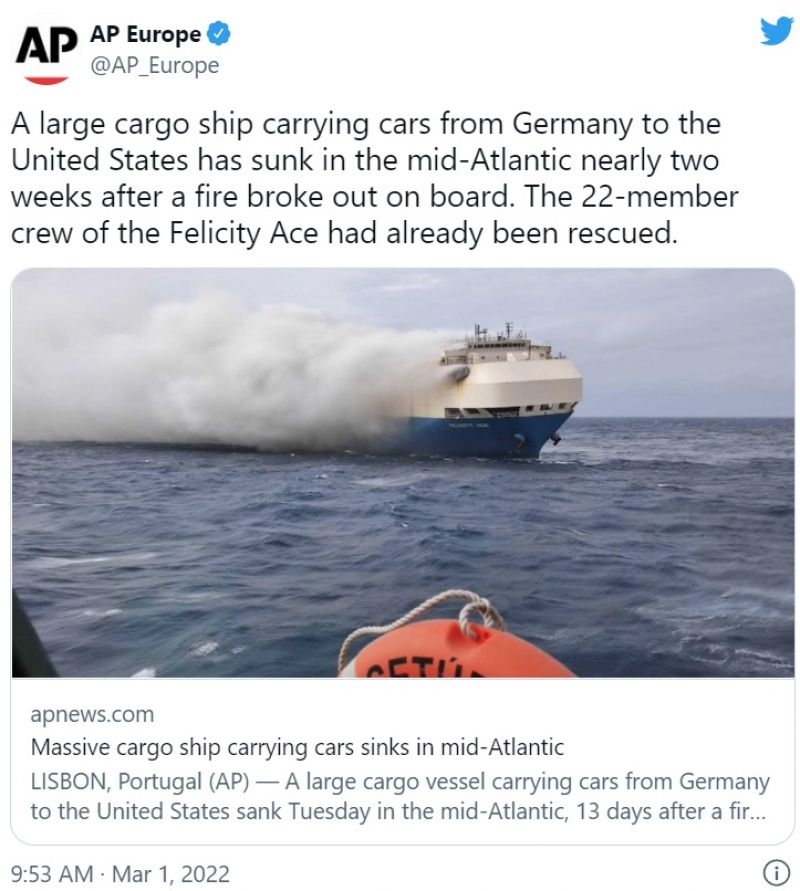 大约两周前一艘名为费利西蒂·艾斯(Felicity Ace)的汽车运输船,装载有近4千辆保时捷、宾利、奥迪、兰博基尼和大众汽车,在大西洋中部的亚速尔群岛附近突发火灾,于本周二上午9点左右,在距离葡萄牙属地亚述群岛海岸外大约220海哩处,遭大浪袭击后,拖船没能让它脱困,右倾45度沉没。