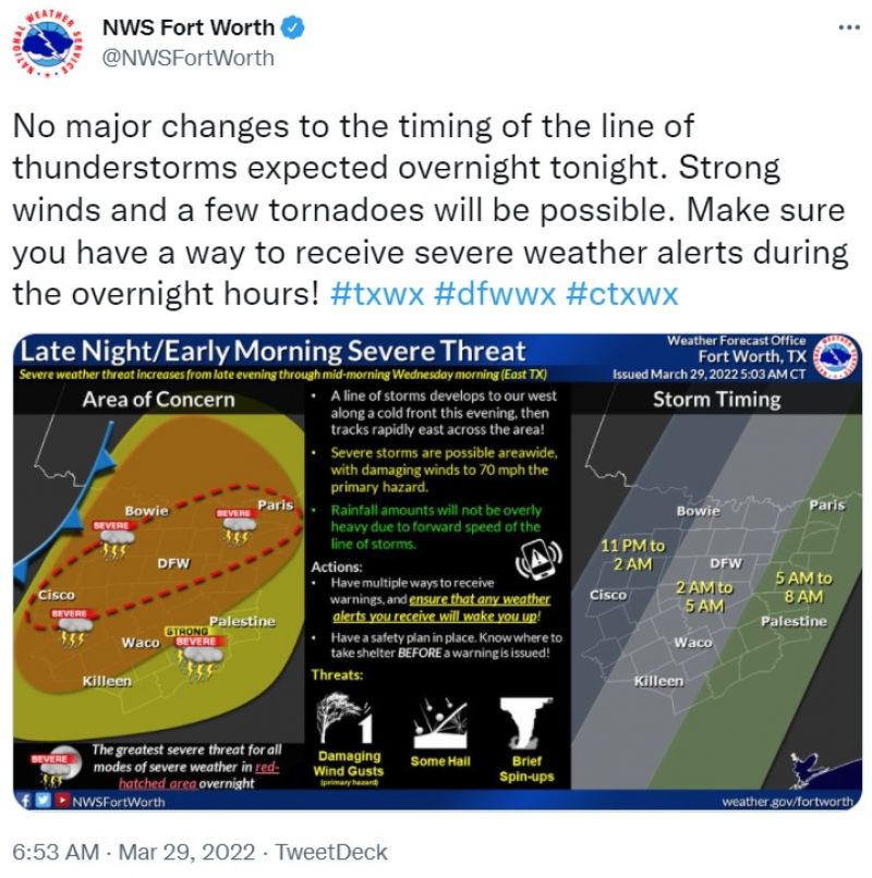 3月29日,沃思堡国家气象局(NWS Fort Worth)发出警报,周二下午和夜晚,达福地区(Dallas-Fort Worth)可能有大风天气,暴风雨天气会给达福地区带来大雨、强风和冰雹,达拉斯南部地区有龙卷风可能。