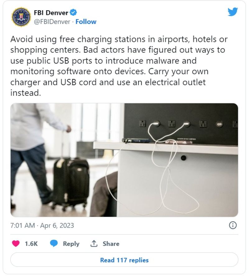FBI表示,免费公共充电站虽然愈来愈普及,但也成为不法之徒的最新武器。民众应避免在机场、酒店、大型商场等地点使用免费公共充电站,原因是不法分子已经找到方法,利用这些公共USB的端口,安装恶意程式,借此入侵手机、平板电脑或手提电脑等设备。