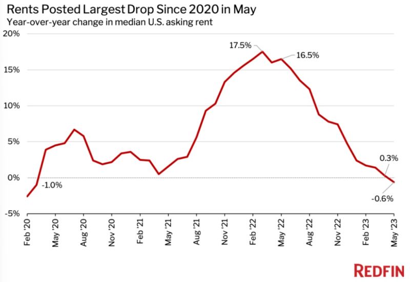 美国 5月 份租金中位数同比下降 0.6% 至 1,995 美元,这是自 2020 年 3 月新冠大流行以来的最大年度跌幅。相比之下,一年前的增幅接近创纪录的 16.5%。5 月的租金下降也代表了自 2020 年 3 月以来租金的首次同比下降。