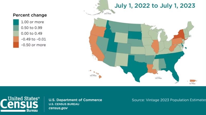 人口增幅最大的包括南卡(1.7%)和爱达荷(1.3%)等中小州份,以及佛州(1.6%)和德州(1.6%)等大州。人口减少的州份有8个,低于前一年的19个。按百分比计算,减幅最大的是纽约(减0.5%)和路易斯安那(减0.3%),加州则损失了大约0.2%人口。