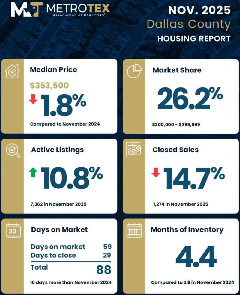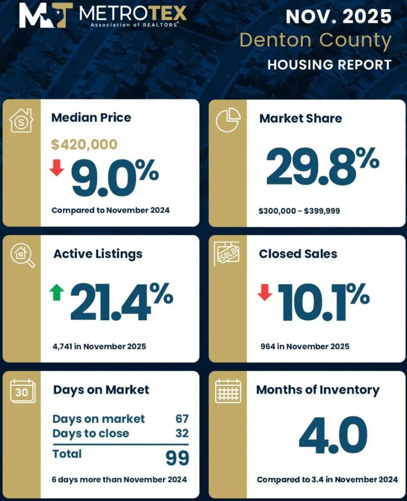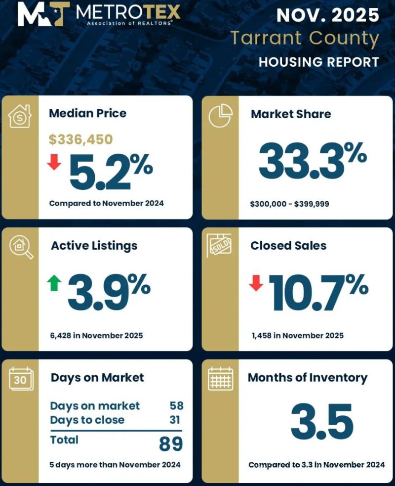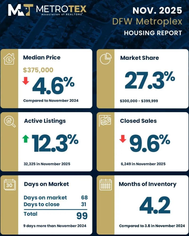 MetroTex(北德州地产经纪人协会)公布了达拉斯-沃思堡地区(Dallas-Fort Worth)2025年 11月份房地产市场数据。11月份,DFW地区房屋价格中位数较去年同期(同比)下跌4.6%,达到375,000美元;活跃房源增加12.3%,房屋库存量增长至4.2(months of inventory),房屋成交量大幅下降9.6%。