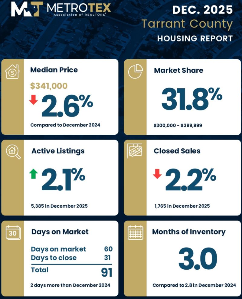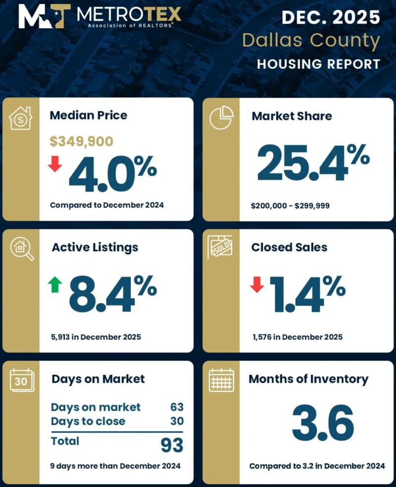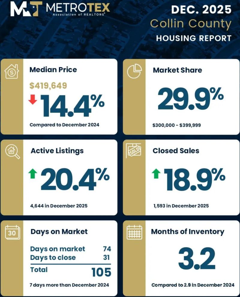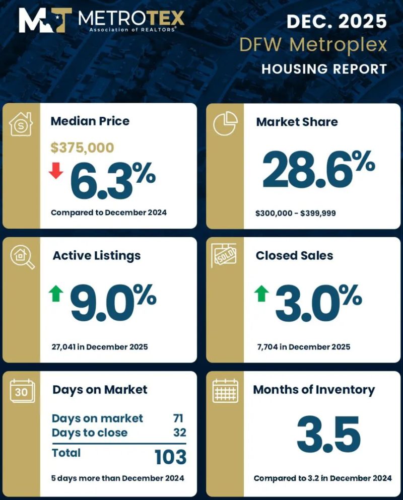 MetroTex(北德州地产经纪人协会)公布了达拉斯-沃思堡地区(Dallas-Fort Worth)2025年 12月份房地产市场数据。12月份,DFW地区房屋价格中位数较去年同期(同比)下跌6.3%,达到375,000美元;活跃房源增加9%,房屋库存量增长至3.5(months of inventory),房屋成交量上升3%。