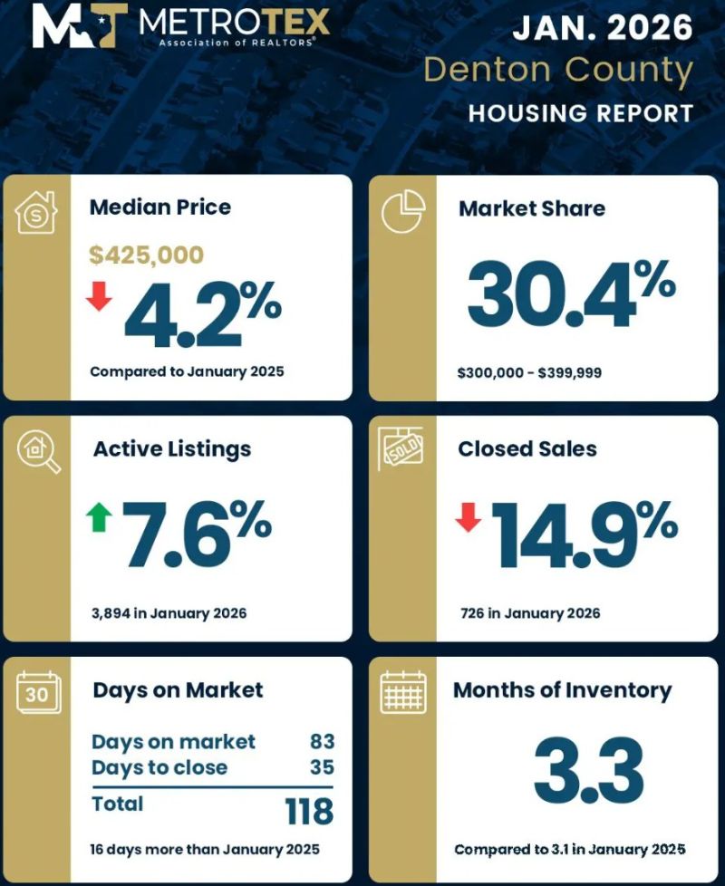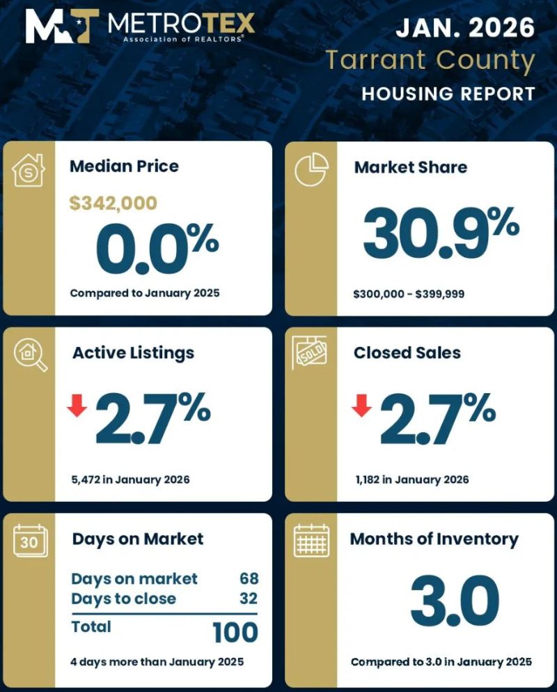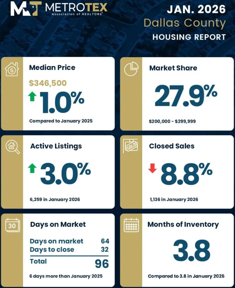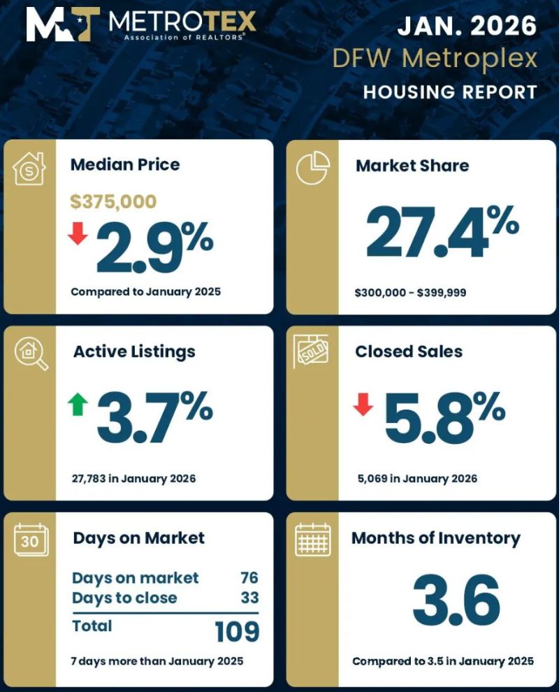 MetroTex(北德州地产经纪人协会)公布了达拉斯-沃思堡地区(Dallas-Fort Worth)2026年 1月份房地产市场数据。1月份,DFW地区房屋价格中位数较去年同期(同比)下跌2.9%,达到375,000美元;活跃房源增加3.7%,房屋库存量增长至3.6(months of inventory),房屋成交量下降5.8%。