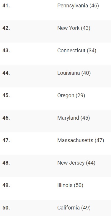 而美国人口流出最多的地区分别是加利福尼亚州,伊利诺伊州和新泽西州。除气候原因外,更多的是经济和政治原因。下面是排在前十的地区: