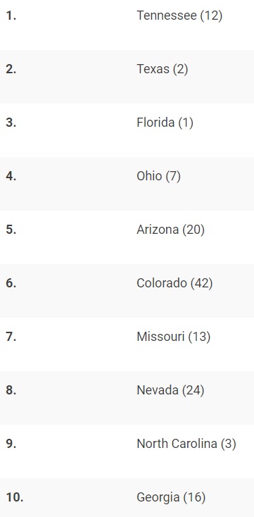 根据U-Haul公司的数据,2020年中,人口流入最多的州是美国中部的田纳西州,排在第二、第三位的分别是德克萨斯州和佛罗里达州。德克萨斯州和佛罗里达州已经连续5年排在最前列。下面是排在前十的地区: