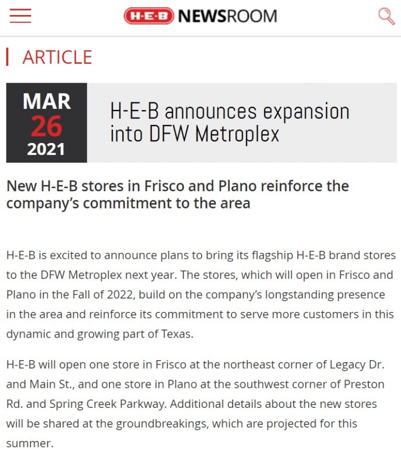Frisco的H-E-B将建在Legacy Dr.和Main St.的东北角。Plano的H-E-B将建在Preston Rd.和Spring Creek Parkway的西南角。