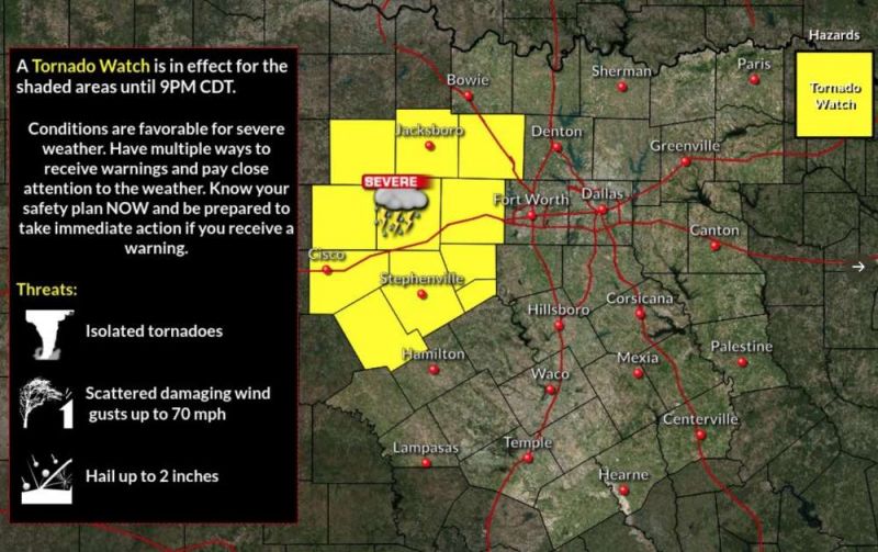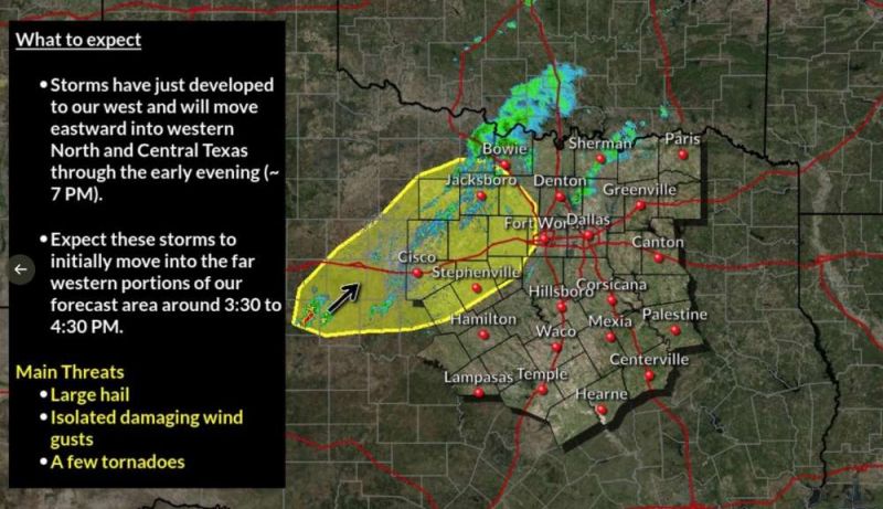 4月28日,沃思堡国家气象局(NWS Fort Worth)发出警报,今晚9点前,达福地区(Dallas-Fort Worth)有龙卷风和冰雹可能,暴风雨天气会给达福地区带来大雨、强风和2英寸直径的冰雹。