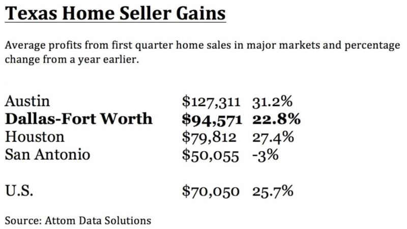 2021年第一季度全美房价继续走高,有限的房源和更多的人搬来德克萨斯州生活和工作,或者看好德州将来的房地产市场,继续推高了德州达拉斯、休斯顿、奥斯汀等地区的房价。达拉斯-沃思堡地区(Dallas-Fort Worth)的房屋卖家发现房屋的卖价纷纷创下历史新高——房屋销售的平均利润达到了创纪录的94,571美元(同样,他们需要用更多的钱来购买另一套房屋)。