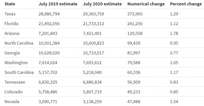 根据美国人口普查局(U.S. Census Bureau)的数据,德克萨斯州2020年的居民人数比2019年增加373,965人,超过全美任何其他地区。紧随其后依次是: